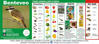 • Trocitos de pollo magro, al Benteveo y al Martín pescador se le da también pescaditos de río; se les debe poner en un recipiente con agua, y ellos los pescarán.
